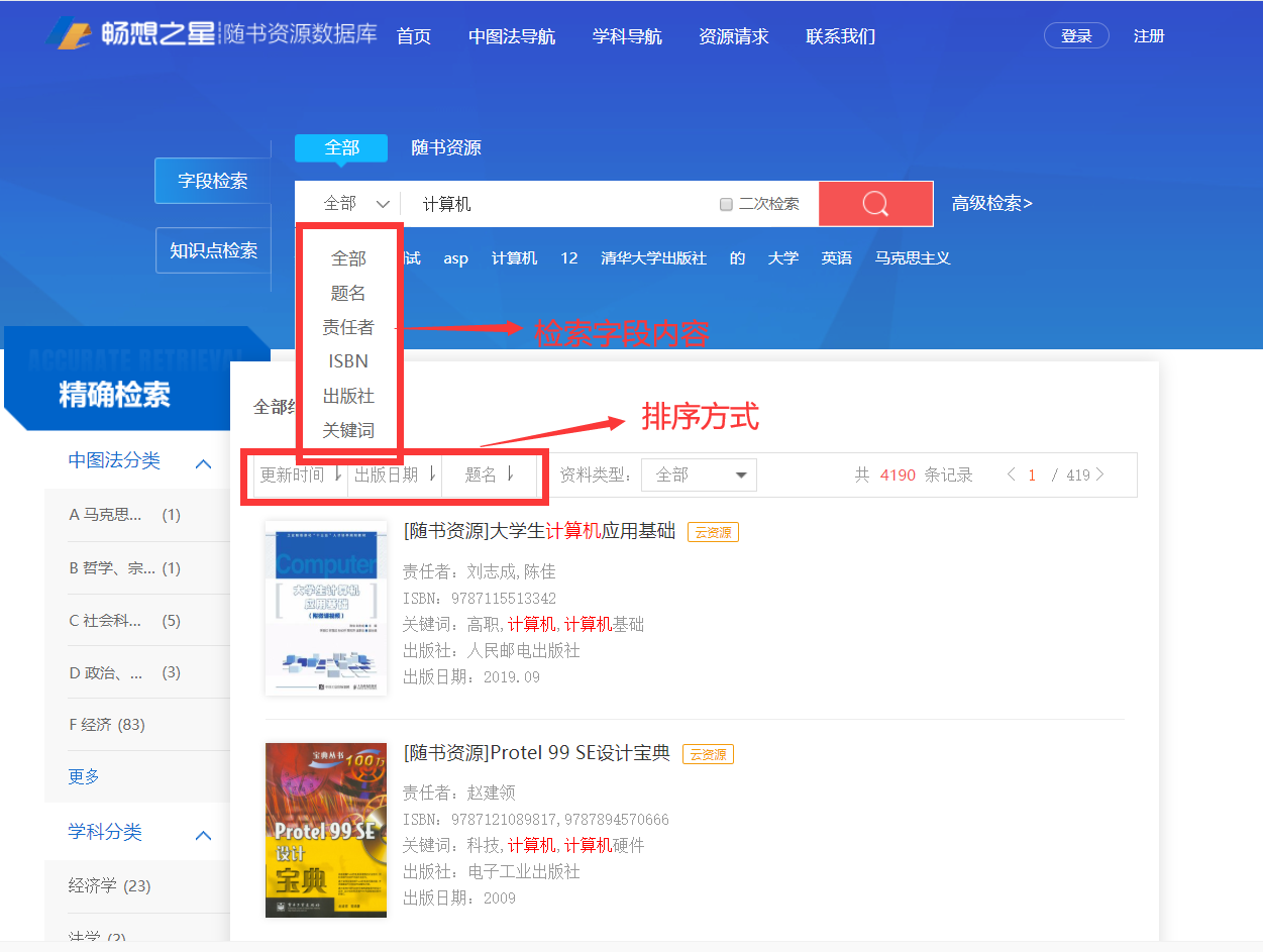 单击资源题名打开资源详细信息页面。检索字段包括全部、题名、责任者、ISBN、出版社、关键词,默认是按全部检索。排序字段:包括更新时间升序、更新时间降序、出版日期升序、出版日期降序、题名升序、题名降序。