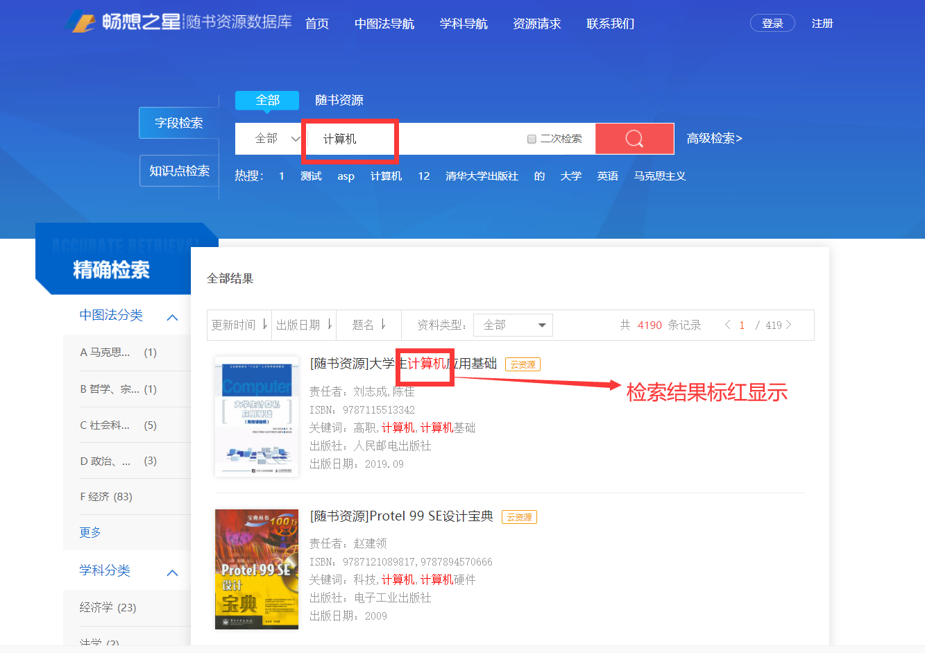 读者在输入检索词检索后,进入检索结果的摘要信息页面,如下面图4所示,检索结果页面符合条件的检索会标红。