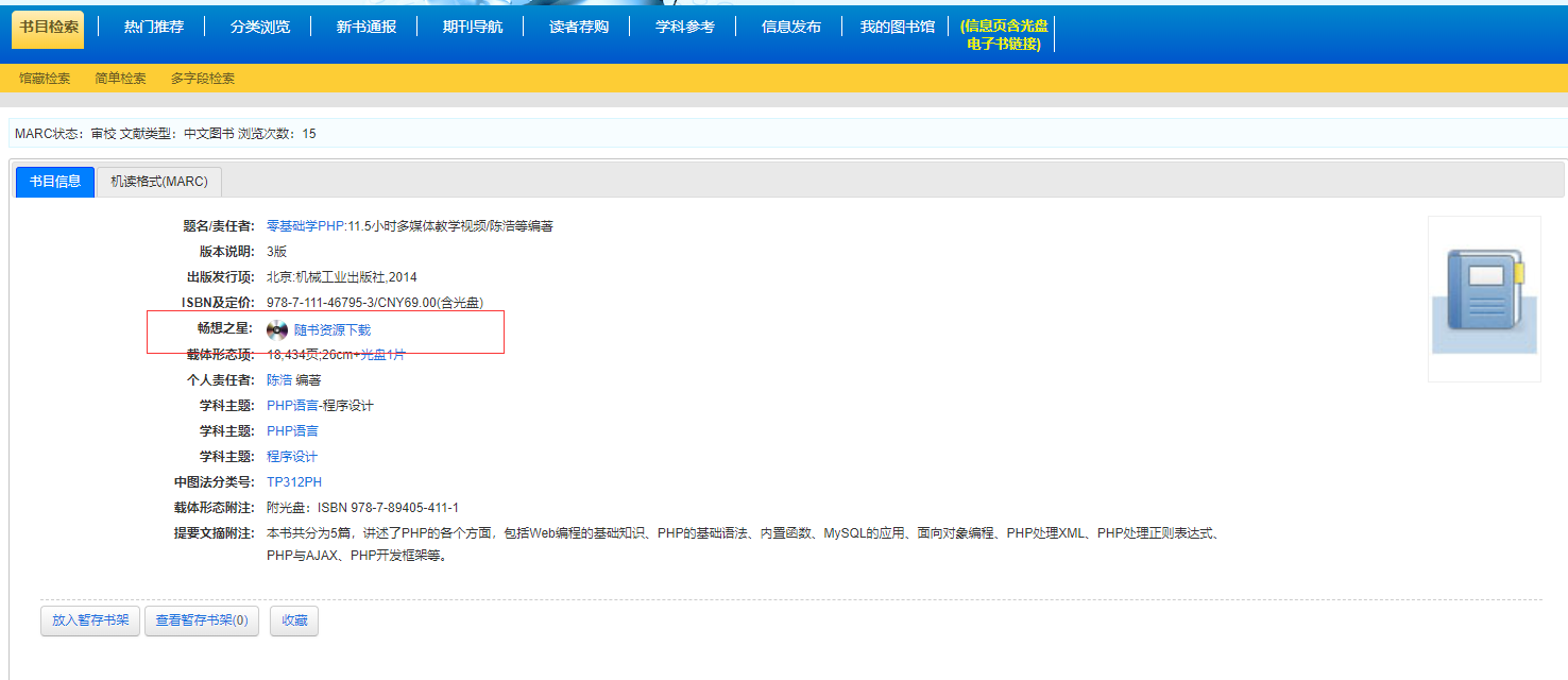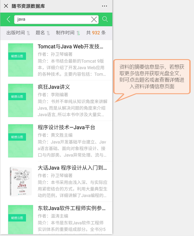 读者在输入检索词检索后,进入检索结果的摘要信息页面,如下图所示,单击资源题名打开资源详细信息页面。检索字段包括书名、作者、ISBN,默认是按全部检索。排序字段:出版时间、题名、制作时间。