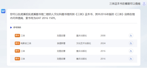 示例二:请帮我找一下《三体》的馆藏位置